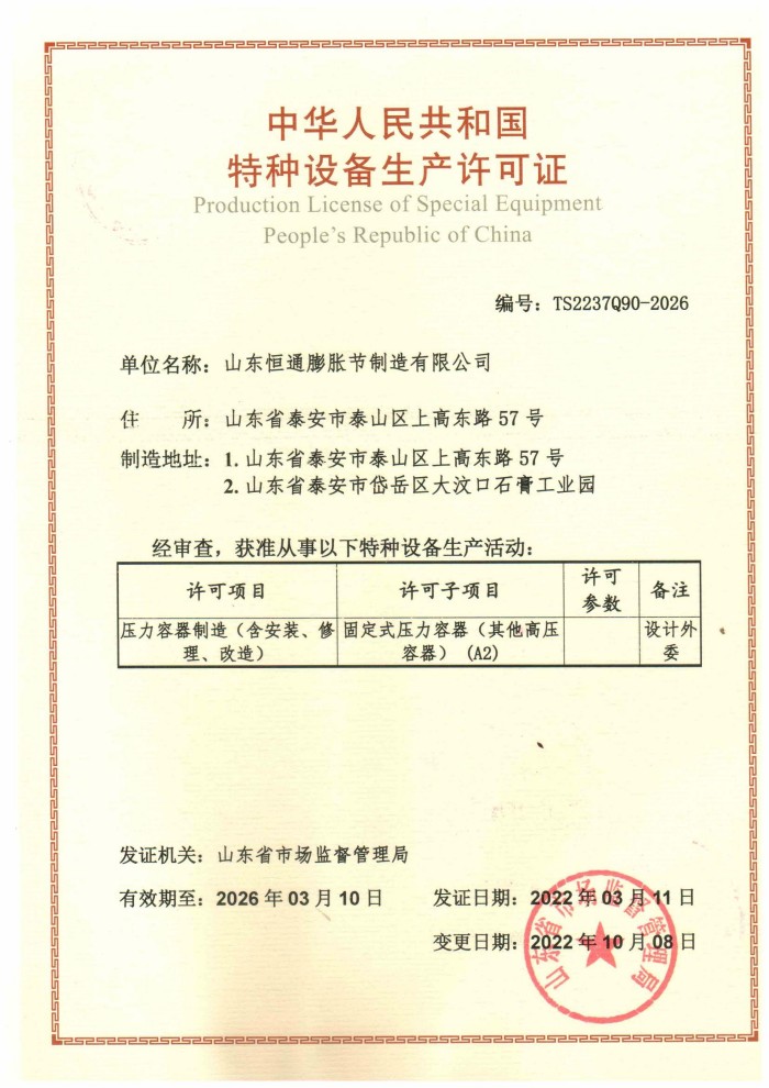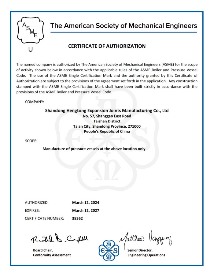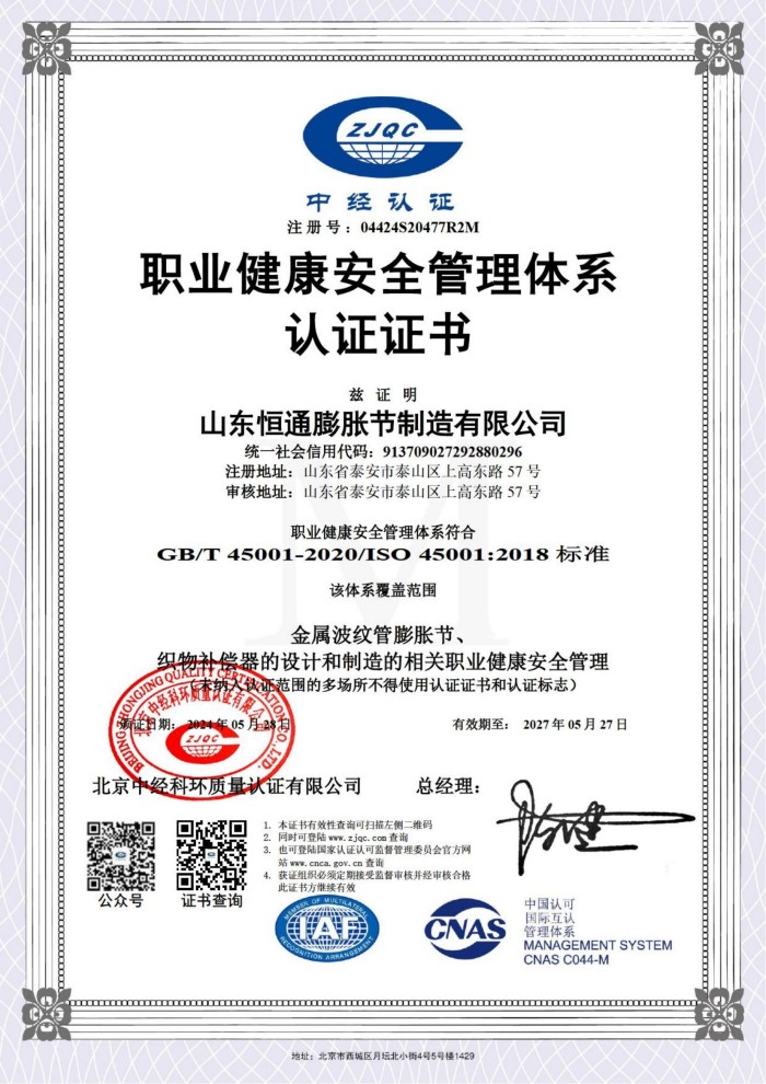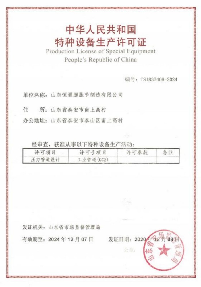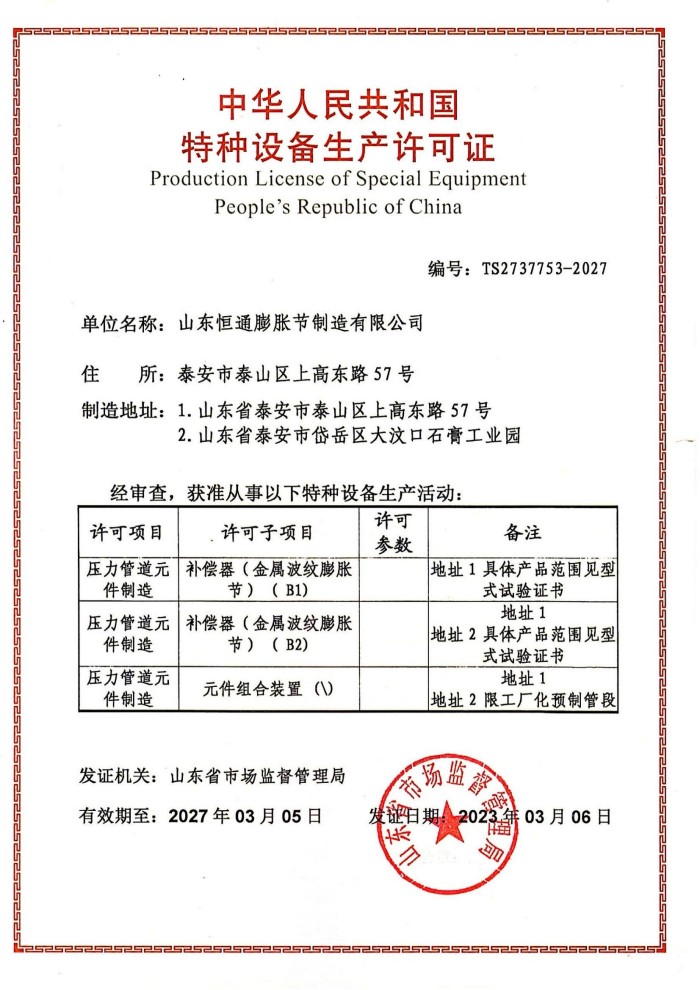 公司取得我國特種設(shè)備制造許可證、壓力容器A1級(jí)資質(zhì)、壓力管道元件A、B的資質(zhì),并且獲得了歐盟PED-CE認(rèn)證、美國ASME“U”鋼印、ISO 9000質(zhì)量管理體系認(rèn)證、GB/T 14000 環(huán)境管理體系認(rèn)證及GB/T 45000 職業(yè)健康安全體系認(rèn)證。膨脹節(jié)產(chǎn)品涵蓋壓力管道波紋膨脹節(jié)、壓力容器波形膨脹節(jié)、金屬波紋管、金屬軟管、聚四氟補(bǔ)償器、橡膠補(bǔ)償器及非金屬補(bǔ)償器等。